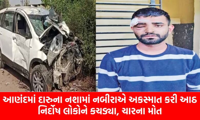 આણંદના નાવલી ગામ પાસે ગુરુવાર રાત્રીના આ અકસ્માત સર્જાયો હતો. અકસ્માતમાં ફૂલ ઝડપે આવેલી કાર દ્વારા અનેક લોકોને અડફેટે લેવામાં આવ્યા હતા. કાર ચલાવનાર નબીરા દ્વારા દારૂના નશામાં અંદાજે આઠ લોકોને કચડી નાખવા માં આવ્યા હતા. દારૂ પીને ફૂલ ઝડપે કાર ચલાવનાર જેનિસ પટેલ દ્વારા બે બાઇક અને સામેથી આવતી બે બાઈકને અડફેટે લઈ આઠ વ્યક્તિ ને કચડી નાખવા માં આવ્યા હતા. આ અકસ્માતમાં ચાર લોકોનાં મોત નીપજ્યાં હતાં. આ અકસ્માતના વીડિયો સોશિયલ મીડિયામાં પણ વાયરલ થયા છે. આ મામલામાં કાર ચાલક આરોપીની આણંદ ગ્રામ્ય પોલીસ દ્વારા ધરપકડ કરી તેની વિરુદ્ધમાં સાપરાધ માનવવધ અને દારૂબંધીની કલમોનો ઉમેરો કરી વધુ તપાસ હાથ શરુ કરવામાં આવી છે.