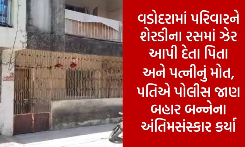 વડોદરાના તરસાલી વિસ્તારથી મોટા સમાચા સામે આવ્યા છે. આ વિસ્તારમાં પરિવારને શેરડીના રસમાં ઝેર આપી દેતા પિતા અને પત્નીનું મૃત્યુ નીપજ્યું હતું. ત્યાર બાદ પતિ દ્વારા બન્નેના પોલીસની જાણ બહાર અંતિમસંસ્કાર કરી નાખવામાં અવ્યા હતા. જ્યારે પુત્રને સયાજી હોસ્પિટલમાં આઇસીયુમાં સારવાર માટે લાવવામાં આવ્યો હતો. પોલીસ પૂછપરછ પછી ઝેર પિવડાનાર પરિવારના મોભી દ્વારા ઝેર પી લેતાં તેમને પણ સારવાર માટે ખસેડવામાં આવ્યા છે.