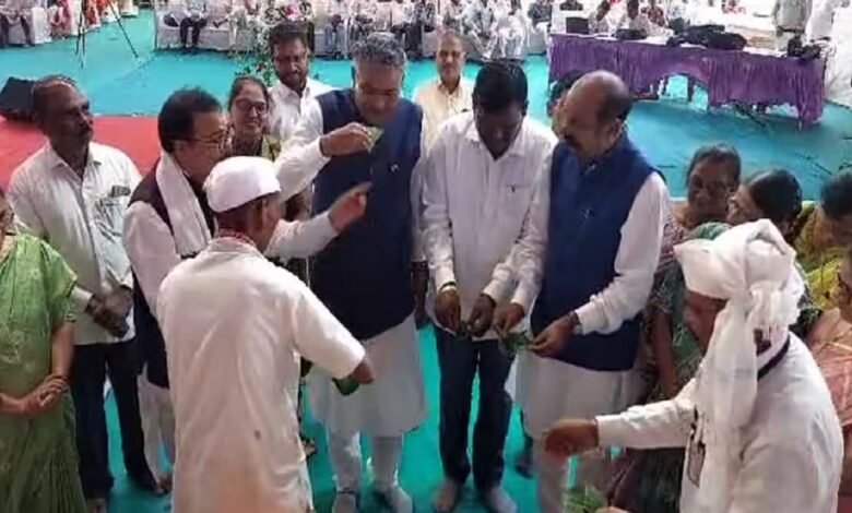 નર્મદા જિલ્લાના ડેડીયાપાડામાં આજે વિશ્વ આદિવાસી દિવસની ઉજવણી કરવામાં આવી હતી. આ કાર્યક્રમની ઉજવણીમાં રાજ્યના કૃષિમંત્રી રાઘવજી પટેલ પણ હાજર રહ્યા હતા. જ્યારે આદિવાસી દિવસની ઉજવણી દરમિયાન પૂજામાં દેશી દારૂથી ધરતીમાતાને અભિષેક કરવા માટેની પરંપરા વર્ષોથી ચાલતી આવી છે. એવામાં આજે પણ દેશી દારૂનો નૈવેધ ચડાવવામાં આવ્યો હતો. તેની સાથે પૂજા દરમિયાન એક લીલી બોટલમાં દેશી દારુ પણ રહેલો હતો તે પૂજા માટે મંત્રી સહિત મહાનુભાવોને અપાયો હતો.