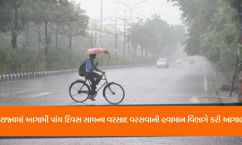 ગુજરાતમાં છેલ્લા થોડા દિવસોથી વરસાદે વિરામ લીધેલો છે. તેમ છતાં કેટલાક વિસ્તારોમાં છુટોછવાયો વરસાદ વરસી રહ્યો છે. એવામાં હવે ગુજરાતમાં આગામી પાંચ દિવસ હળવાથી મધ્યમ વરસાદની આગાહી કરાઈ છે. હવામાન વિભાગ દ્વારા દક્ષિણ ગુજરાત અને ઉત્તર ગુજરાતમાં પણ સામાન્ય વરસાદની આગાહી કરાઈ છે. હવામાન વિભાગ દ્વારા સૌરાષ્ટ્રમાં પણ છૂટાછવાયા વરસાદની આગાહી કરવામાં આવી છે.