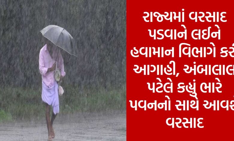 રાજ્યમાં વરસાદ પડવાને લઈને હવામાન વિભાગે કરી આગાહી, અંબાલાલ પટેલે કહ્યું ભારે પવનનો સાથે આવશે વરસાદ