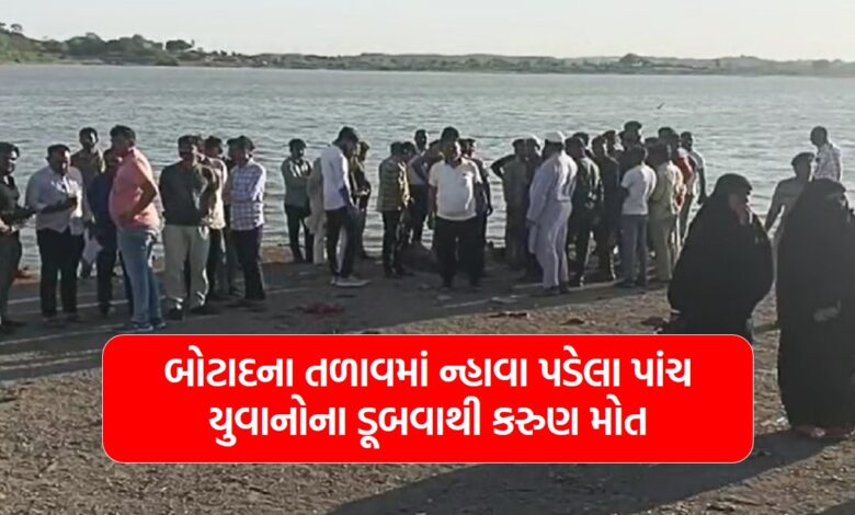 બોટાદથી એક દુઃખદ ઘટના સામે આવી છે. બોટાદ શહેરના કૃષ્ણસાગર તળાવમાં ન્હાવા પડેલા પાંચ યુવાનોના ડૂબવાથી કરુણ મોત નીપજ્યા હોવાનું સામે આવ્યું છે. જાણકારી મુજબ, બે યુવાનો તળાવમાં ન્હાવા માટે પડ્યા અને તે અચાનક ડૂબવા લાગ્યા હતા. એવામાં તેમને બચાવવા ગયેલા ત્રણ યુવાનો પણ તેમની સાથે ડૂબી જતા પાંચેય યુવકનું કરુણ મોત નીપજ્યું હતું. આ ઘટનાની જાણકારી થતા પોલીસની ટીમ ઘટનાસ્થળ પર દોડી આવ્યા હતા.